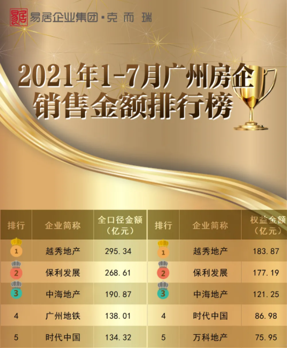 8月6日,克而瑞独家发布《2021年1-7月广州房企销售榜》,永乐国际·F66地产以亮眼业绩表现再次斩获权益金额榜、全口径金额榜双料第一。